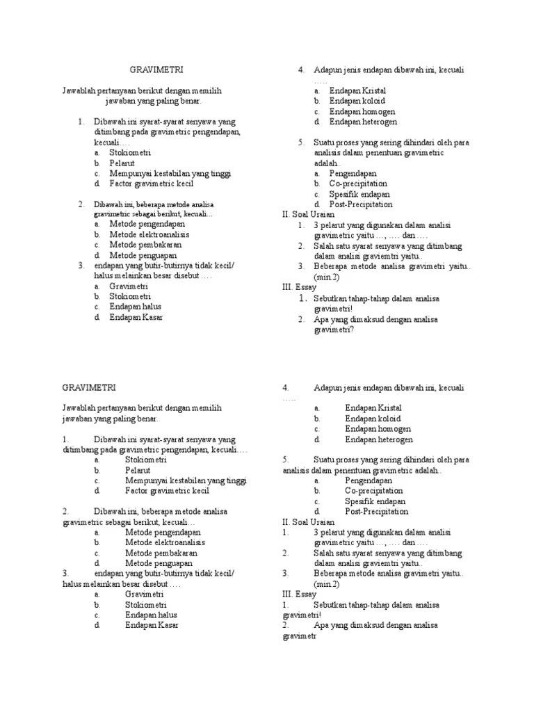 Analisis gravimetri dapat dilakukan dengan cara pengendapan, penguapan dan elektrolisis. Bila belum, maka berat agcl kurang dari semestinya dan banyaknya nacl menurut hitungan hasil analisa juga menjadi kurang dari sebenarnya (terjadi kesalahan negatif). Sifat ini merupakan kemudahan untuk mengikat air dari udara bebas sehingga. Doc analisis gravimetri pengendapan penentuan kadar cu dalam cuso4 5h2o riani jewel academia edu. Teknik kerja titrasi pembentukan senyawa kompleks (kompleksometri).